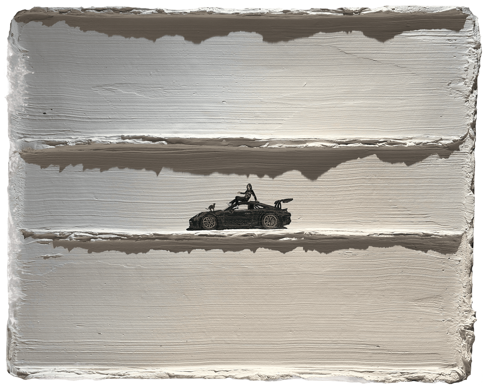 cette œuvre au fond blanc intensément texturé, la silhouette d'une mythique voiture de sport noire