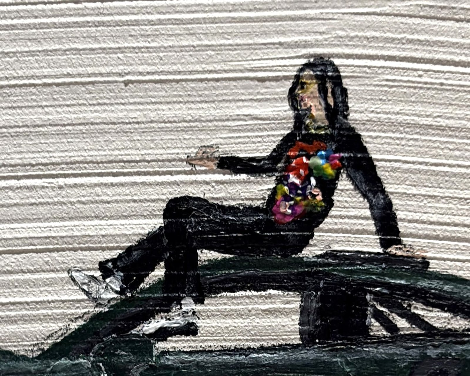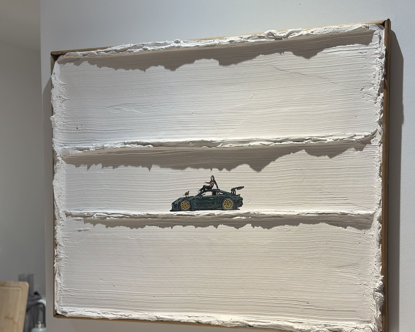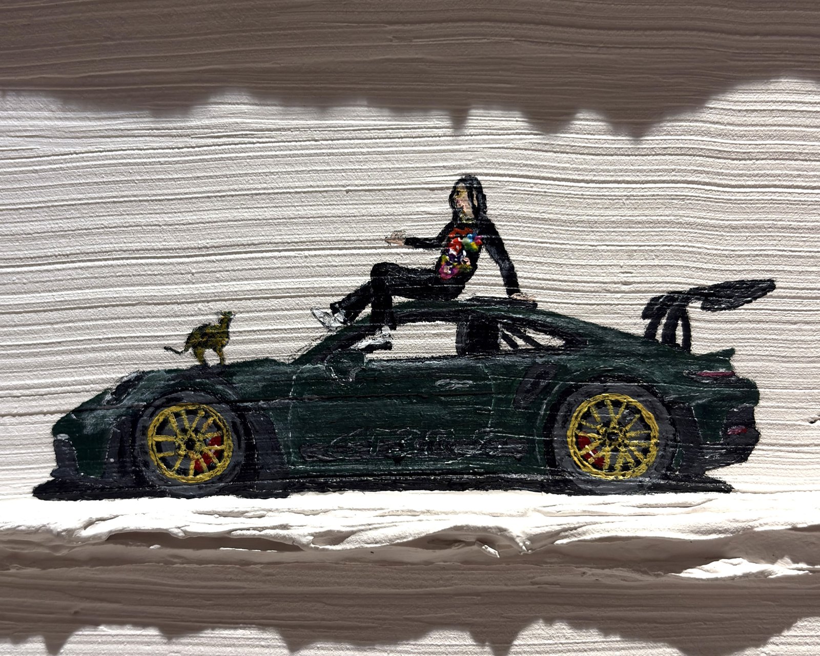 cette œuvre au fond blanc intensément texturé, la silhouette d'une mythique voiture de sport noire